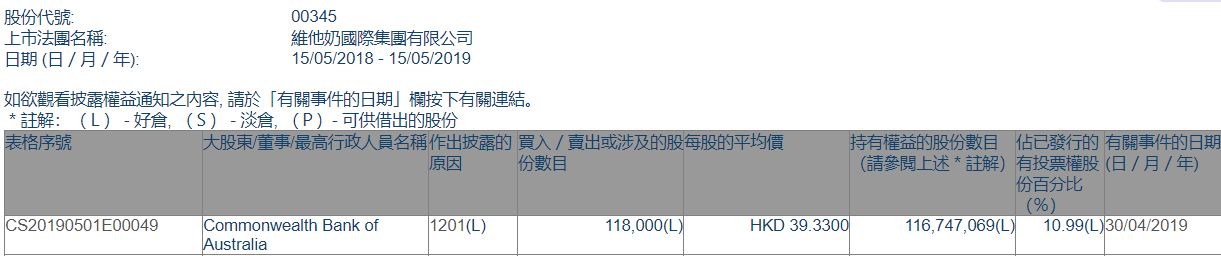 根据港交所最新权益披露资料显示,2019年4月30日, 维他奶(00345.HK)遭Commonwealth Bank of Australia以每股均价39.3300港元,减持11.8万股,总价约464万港元。