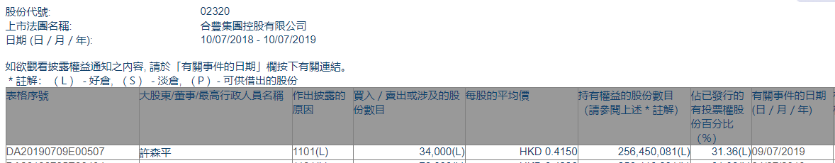 合丰集团(02320.HK)获执董许森平增持3.4万股