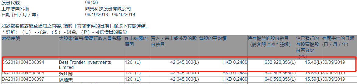 根据港交所最新权益披露资料显示,2019年9月30日,国药科技股份(08156.HK)遭Best Frontier Investments Limited以每股均价0.2480港元,减持4264.5万股,总价约1057.6万港元。