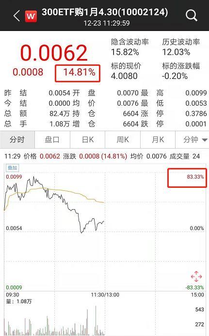 其中,华泰柏瑞300ETF期权认购合约10002124当日上午盘中最高涨幅很快突破了80%左右,随后沪深300指数开始出现震荡走势,该合约涨幅也随即收窄。截至午盘收盘,该份期权合约涨幅为14.81%。