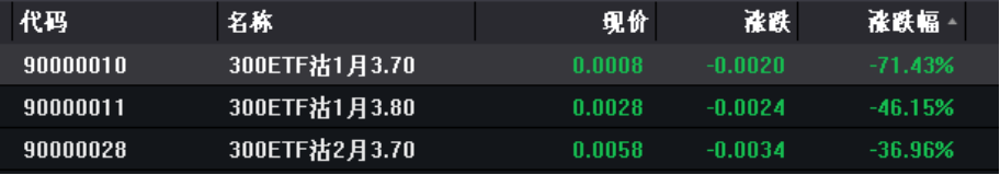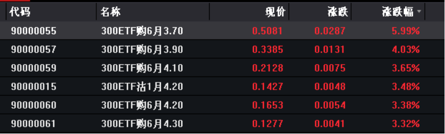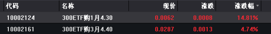 而深交所沪深300ETF期权认购合约最高涨幅为5.99%,认沽合约最高跌幅71.43%。