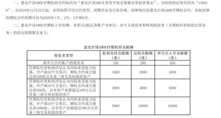 据悉,首批上市合约月份为2020年2月(IO2002)、2020年3月(IO2003)、2020年4月(IO2004)、2020年6月(IO2006)、2020年9月(IO2009)和2020年12月(IO2012)。沪深300股指期权采取持仓限额,即同一客户某一月份的持仓限额为5000手;限价指令的每次最大下单数量为20手。