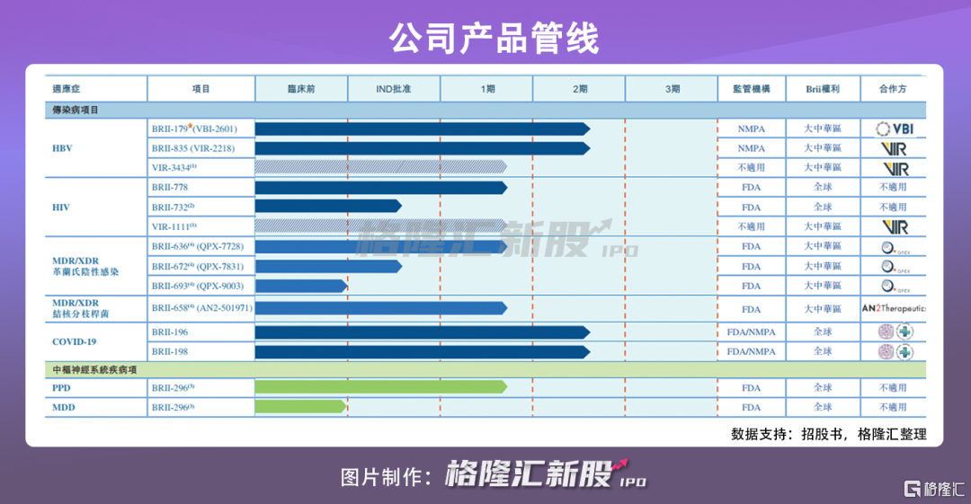 公司的核心产品为BRII-179和BRII-835,该项目自VBI和Vir处获得许可,正在开发HBV功能性治愈疗法联合使用HBV特异性B细胞及T细胞治疗性免疫蛋(BRII-179)以及靶向HBV的siRNA(BRII-835)。公司已在中国、香港、新西兰、澳大利亚、泰国和韩国进行BRII-179的1b/2a期临床研究,并在中国进行BRII-835的2期临床研究。