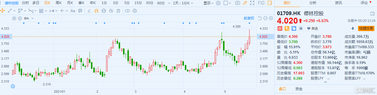 格隆汇5月20日丨德林控股(1709.HK)冲高回落,盘中最大涨幅逾11%,现报4.02港元,涨幅6.6%,最新总市值56.14亿港元。公司午间公告称,预期集团截至2021年3月31日止年度录得除所得税前溢利净额不少于2亿港元,而去年同期录得除所得税前亏损净额约5190万港元。公司董事会认为,主要由于集团将现有业务拓展至提供金融服务及投资业务,有关服务于2019年11月展开,于截至2021年3月31日止年度新金融服务及投资业务为集团贡献毛利。