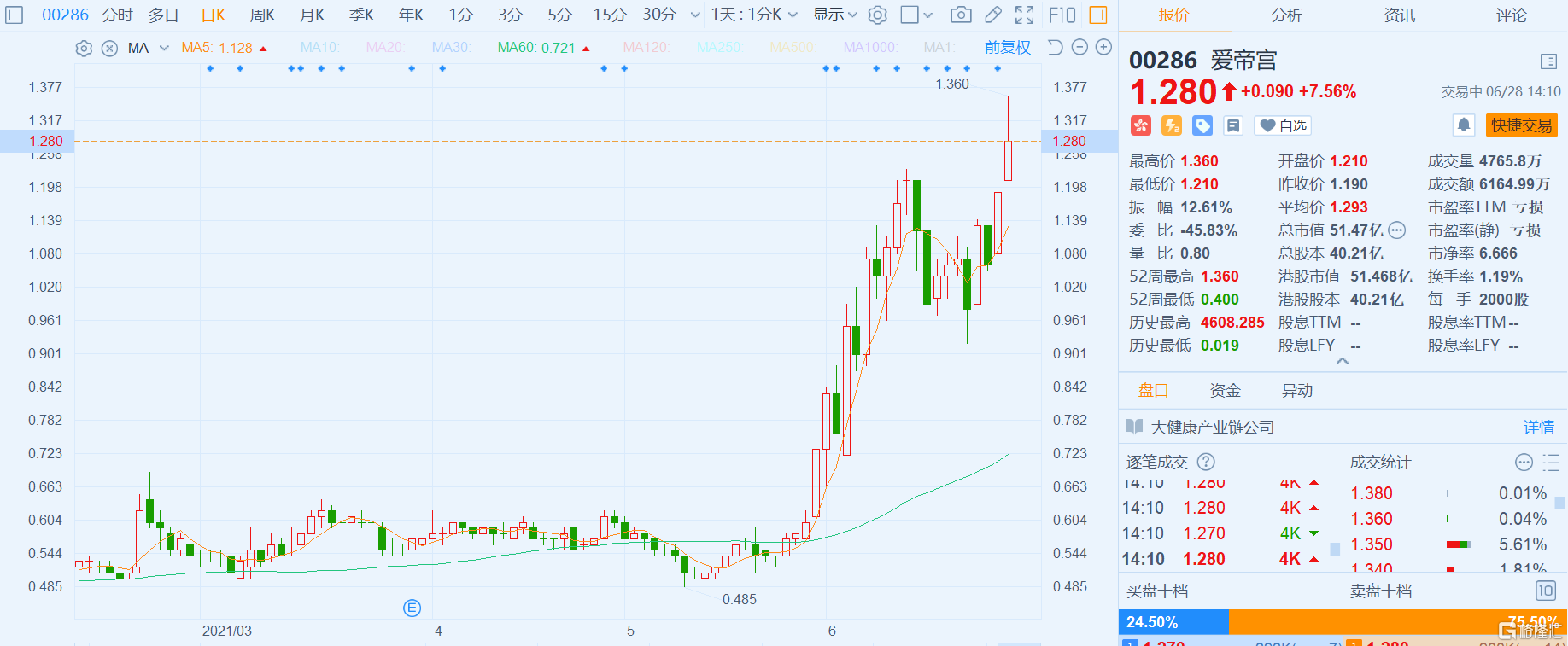 格隆匯6月28日丨愛帝宮(0286.HK)漲7.56%,報1.28港元,高見1.36港元創逾13年新高,最新總市值51.5億港元。愛帝宮昨日公佈,創始人朱昱霏及團隊23人收取其各自有權悉數收取獲利能力付款,並已根據第一份認購協議動用認購第一次認購股份的現金代價。公司已根據第一份認購協議條款完成第一次認購事項,並已於2021年6月25日完成配發及發行第一次認購股份。公司按認購價每股股份0.7港元向相關職員配發及發行合共約2.64億股股份。