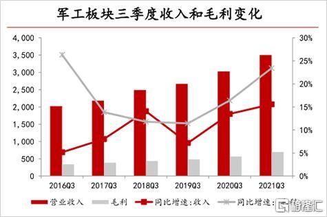 2021年前三季度,軍工板塊整體營收同比增長15.59%,毛利增速23.42%,連續兩年同比增速加快。存貨同比增速則爲31.61%,同比大幅提高,說明在行業高景氣的背景下,各企業也有擴大產能的意願。