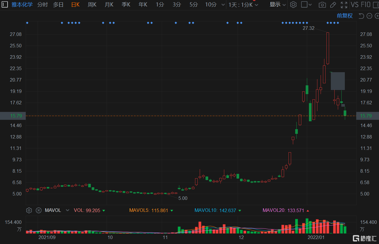 格隆匯2月11日丨雅本化學(300261.SZ)再度跌超10%,跌幅居市場首位。現報15.76元,總市值152億元。在經歷年前多番漲停甚至停牌後,雅本化學節後以來持續大跌,5日累計回撤40%。公司曾發佈股價異動公告,與輝瑞公司無任何業務接洽與合作,未向其供應卡龍酸酐產品。而在此前的多次回覆中,雅本化學含糊的迴應也被投資者質疑爲借輝瑞公司新冠口服藥炒作。而對於該項目採用與輝瑞新冠藥物一致的名稱命名,不少投資者認爲雅本化學仍在蹭概念。