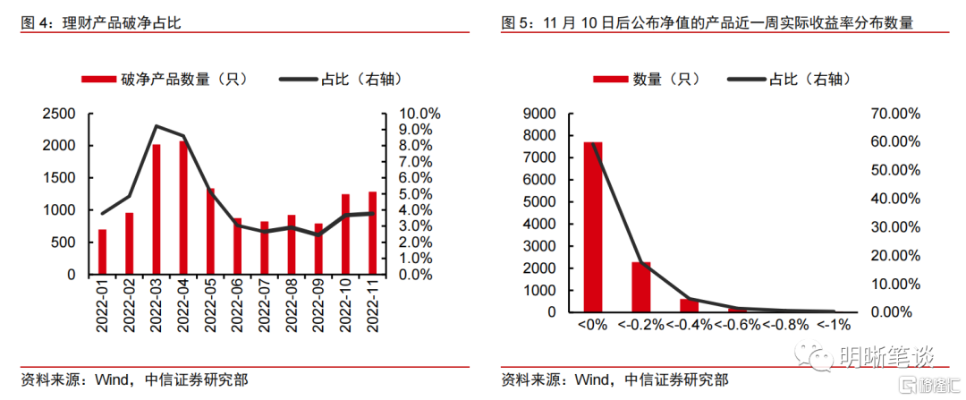 根據Wind數據,截至11月16日,銀行理財破淨數量達到1689只,較11月10日上升399只,佔比達到4.91%,較10日上升1.14pcts,11月10日後公佈淨值的13582只產品中,最近一週有7722只產品錄得負收益,佔比達到59.29%。2022年是銀行理財全面淨值化轉型元年,截至2022年6月底,淨值化比例已經達到了95.09%,基本接近完成,剛兌產品不再,但是投資者心理預期短期內難以改變,客戶對於淨值未能達到業績基準的情況短期尚可接受,但若是跌破淨值或短期內急跌,則會打破很多客戶的心理防線,引發贖回行爲。截至11月16日,銀行理財破淨數量達到1689只,較11月10日上升399只,佔比達到4.91%,較10日上升1.14pcts,11月10日後公佈淨值的13582只產品中,最近一週有7722只產品錄得負收益,佔比達到59.29%。