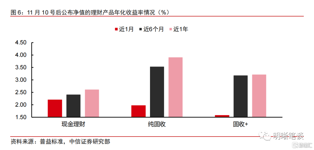 根據普益標準數據,11月10日後公佈淨值的現金理財、純固收和固收+產品近1月的年化收益率(無近一週收益率數據)相較近6個月和近1年均有明顯下降,理財表現不佳,很有可能引發投資者贖回。除Wind數據外,我們也蒐集了普益標準的數據作爲佐證。在11月10日後公佈淨值的現金理財、純固收和固收+產品分別有374、1207、7256只,近1個月年化收益率平均值分別爲2.21%、1.98%、1.59%,而近6個月年化收益率平均值分別爲2.42%、3.54%、3.19%,近1年年化收益率平均值分別爲2.62%、3.92%、3.63%,差距較爲明顯,可以佐證銀行理財在債市回調影響下收益率受到了較大的影響,可能引發投資者贖回,反作用於債市。