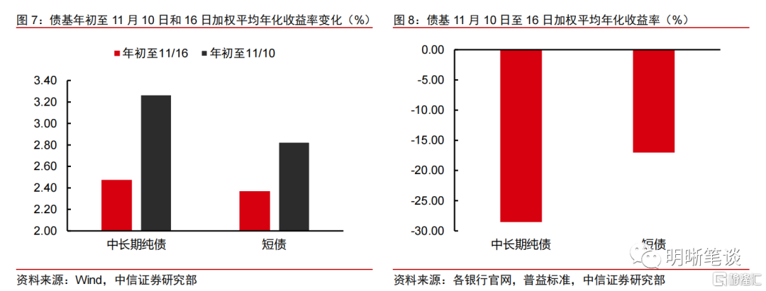 債市超預期大幅回調引發資管產品淨值回撤是主因:根據Wind數據,截至11月16日,銀行理財破淨數量達到1689只,較11月10日上升399只,佔比達到4.91%,較10日上升1.14pcts,11月10日後公佈淨值的13582只產品中,最近一週有7722只產品錄得負收益,佔比達到59.29%;根據普益標準數據,11月10日後公佈淨值的現金理財、純固收和固收+產品近1月的年化收益率相較近6個月和近1年也均有明顯下降。除銀行理財外,債基近期表現也較差,收益率下行明顯,可能引發銀行表內委外和銀行理財配置債基的贖回。