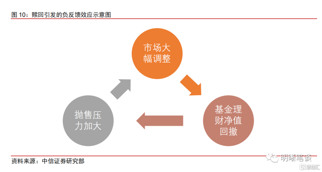 銀行理財和基金客戶習慣於“追漲殺跌”,申贖行爲的“順週期性”往往會放大市場波動,再度引發淨值調整,繼而再度激起贖回壓力,形成負反饋效應。投資者由於金融知識的相對有限和出於追漲殺跌的心理本能,對於市場的短期波動忍受度較差,容易引發贖回行爲,而機構往往被迫跟隨贖回。當理財和基金拋售壓力較大時,又會引發市場繼續調整,繼而進一步影響淨值,繼續引發贖回壓力,形成“債市下跌-淨值回撤-產品贖回-被動拋售-債市繼續下跌…”的負反饋模式。