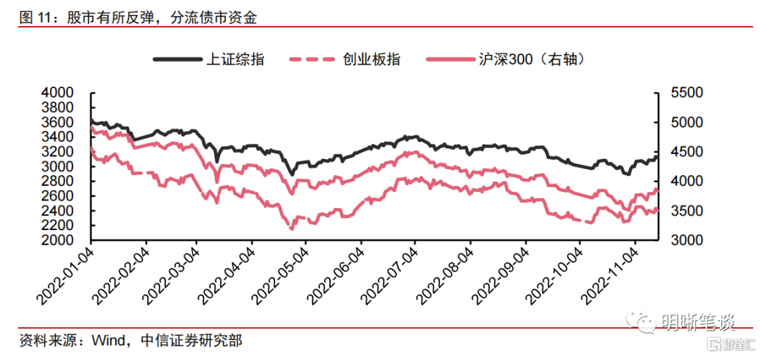 權益市場復甦分流債市資金也是重要原因之一。8月以來,10年期國債收益率震盪上行,債市表現承壓,導致債券基金、銀行理財等產品的業績也隨之下滑,進入11月後,防疫政策的優化以及針對地產等行業的“寬信用”舉措持續出臺,投資者對政策以及長期經濟的預期發生轉變,愈發看好權益市場復甦,因此開始主動調倉,導致債基等固收類產品被提前贖回,管理人不得不拋售債券資產,導致債市面臨較大的贖回壓力。