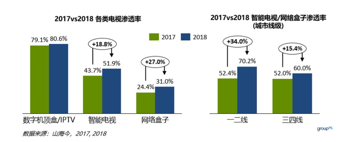 2018年,无论是智能电视还是网络电视盒子的渗透率都出现大幅的增加,2018年有超过半数的家庭拥有智能电视。2018年,一二线城市有智能电视或者网络盒子的家庭占比增长34%,且渗透率在2018年差距拉大。