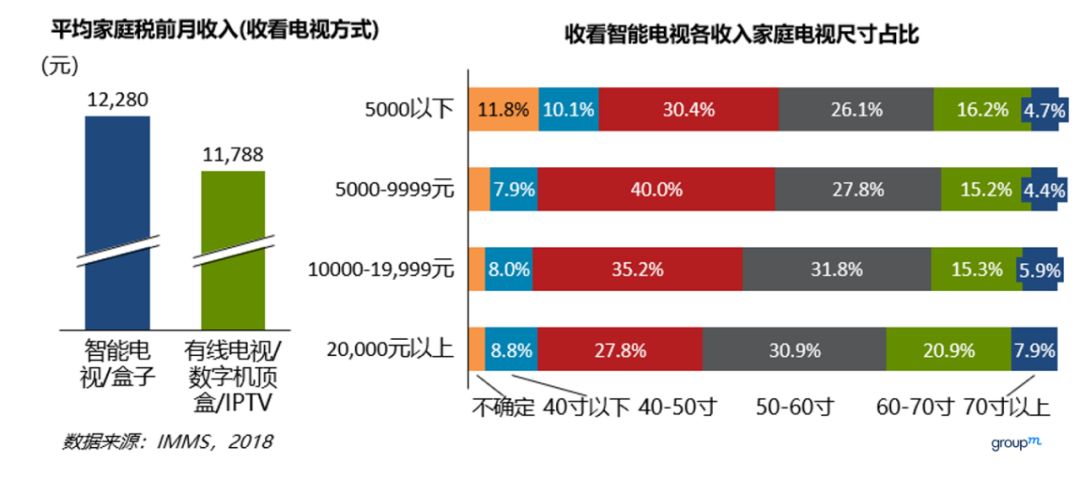 收看智能电视或者电视盒子的人群平均家庭税前收入高于收看传统电视人群。收入低的人群对于电视尺寸敏感度最低,收入越高的人群购买50寸以上电视的占比更高,家庭月收入超过两万的人群购买60寸以上大屏电视的占比最高。