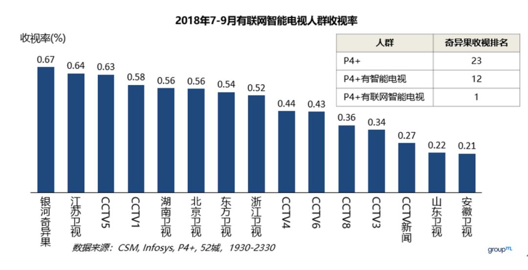 银河奇异果在所有人群中的晚间收视率排名为23(包含所有央卫视),而银河奇异果在家中有联网智能电视的人群中的晚间收视率排名为第一,有连接互联网的智能电视的人群会更多的选择直接用银河奇异果收看电视。