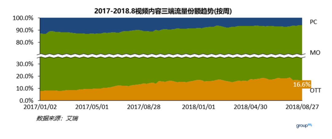 OTT端为网络视频贡献的流量占比越来越高,该占比在2018年8月27号当周上升为16.6%。反之,PC端为网络视频贡献的流量占比越来越少。
