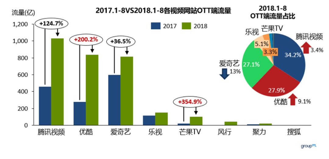 各视频网站的视频内容在OTT端同比皆有较大增幅,流量前三的视频媒体中,优酷的视频内容在OTT端的流量占比增幅最大。腾讯视频在2018年上升为流量占比第一的媒体。