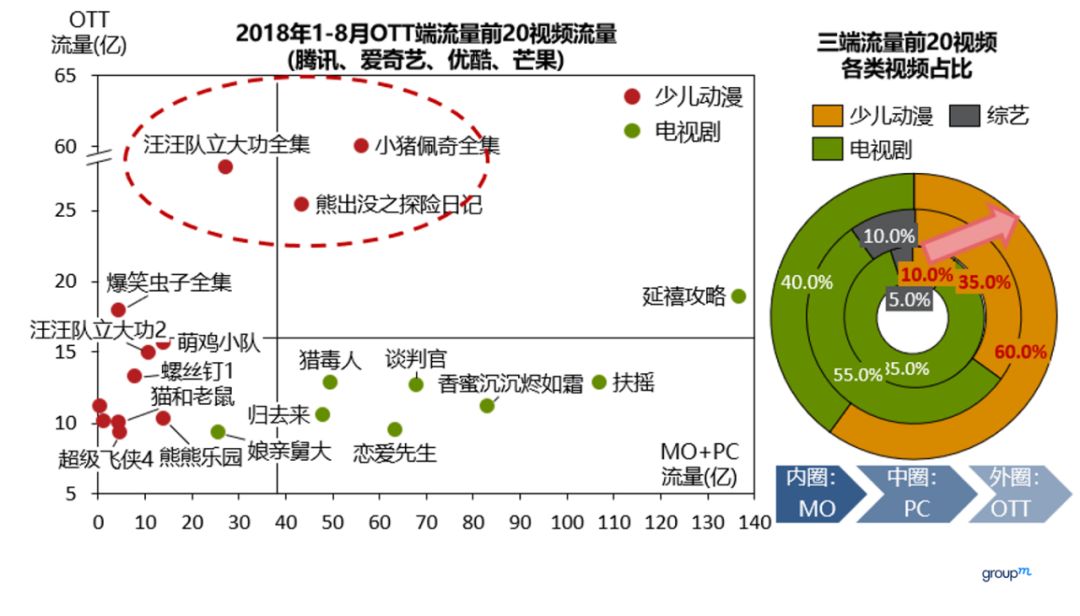 • OTT视频内容表现:OTT端为网络视频贡献的流量占比越来越高,动漫/少儿类的节目在OTT端的流量占比为三端最高。有孩子的家庭在OTT设备上和在手机及电脑这两种互联网设备上看动漫少儿节目占比接近; 2018年腾讯视频OTT端视频内容流量占比为所有视频网站第一。各视频网站的视频内容在OTT端同比皆有较大增幅,流量前三的视频媒体中,优酷在OTT端的流量占比增幅最大; 屏幕越大,头部节目中少儿动漫类份额越高。OTT端流量排名前20的视频中,超半数视频为少儿动漫,《小猪佩奇》、《汪汪队》、《熊出没》这三部热门动画为OTT端流量前三甲。而PC端和手机端,流量靠前节目中电视剧占比最高。
