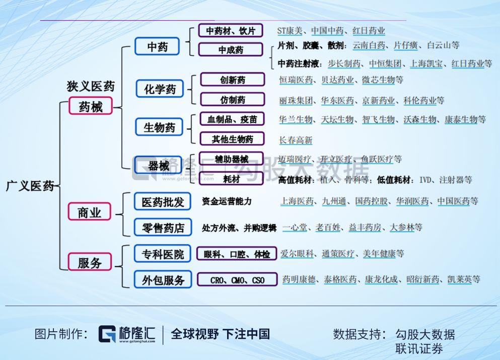 顾名思义,医药行业是“医+药”,前者是指为消费者等主体提供医疗相关服务的公司;后者的范围很广,包括“制药”、“器械”以及相关产业链的公司(比如CDMO、配送、零售等)。显然,医药行业其实是一个细分领域极多的行业。