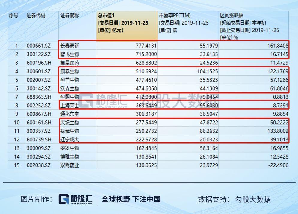 另一大工业板块生物制品也呈现了严重的分化:血制品、疫苗以及生长激素等消费型生物药今年都有极好的表现,主要是没有政策压力、业绩又能不停兑现(当然,估计拥抱核心资产也是涨幅惊人的原因之一);但是另一方面,200亿市值以下的生物制品公司没有一家跑赢医药行业指数,这些小市值公司就真的基本面也很差吗?