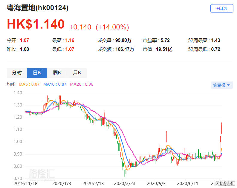 格隆汇7月24日丨继昨天大涨近15%后,粤海置地(0124.HK)今日再度涨14%,报1.14港元,总市值19.5亿港元。