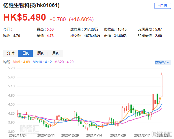 港股异动 | 亿胜生物科技(1061.HK)逆势大涨逾16% 股价创8个月新高