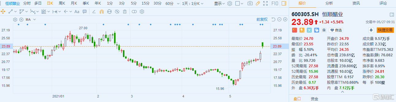 格隆汇5月27日丨恒顺醋业(600305.SH)高开逾9%后回落,现报23.89元,涨幅5.94%,最新总市值239.6亿。公司26日公告称,拟以自有资金或自筹资金回购不超过1002.9560万股股份,回购价不超过人民币28元/股(含)。