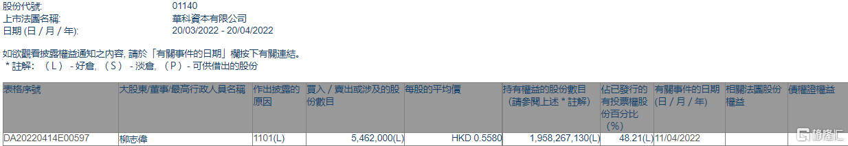 华科资本(01140.HK)获执行董事兼主席柳志伟增持546.2万股