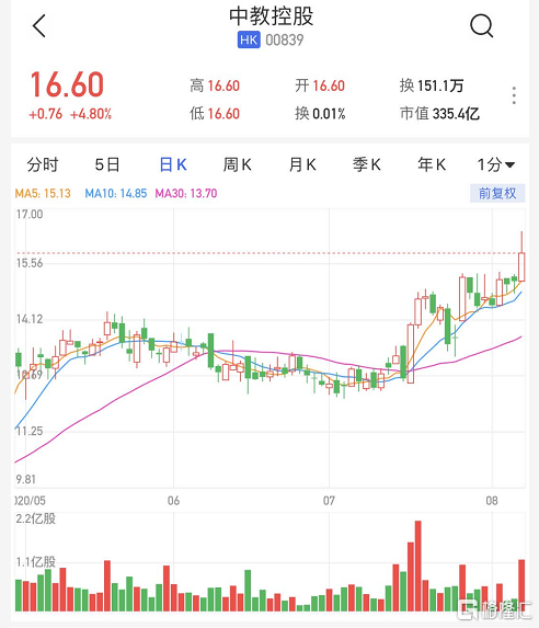 格隆汇8月10日丨中教控股(0839.HK)高开近5%,报16.6港元股价刷新历史新高,总市值达335.4亿港元。