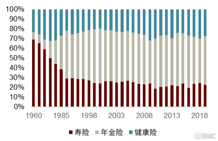 圖表11:1960-1985年,美國人身險產品以壽險為主,1985年以後年金險佔比躍居第一(淨保費口徑)