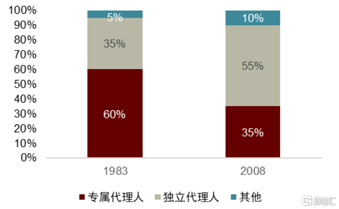 ►人身險產品複雜化對營銷員的專業素質提出了更高要求,專屬代理人渠道無法應對多元化的市場需求,出現產能停滯等情況。1983-2008年,專屬代理人新單貢獻由60%下降至35%,產能的下降進一步凸顯自建代理人渠道的成本劣勢,1990-2000年,專屬代理人渠道成本躍居第一,每100美元新單保費對應147美元的渠道成本,遠高於直銷和獨立代理渠道。