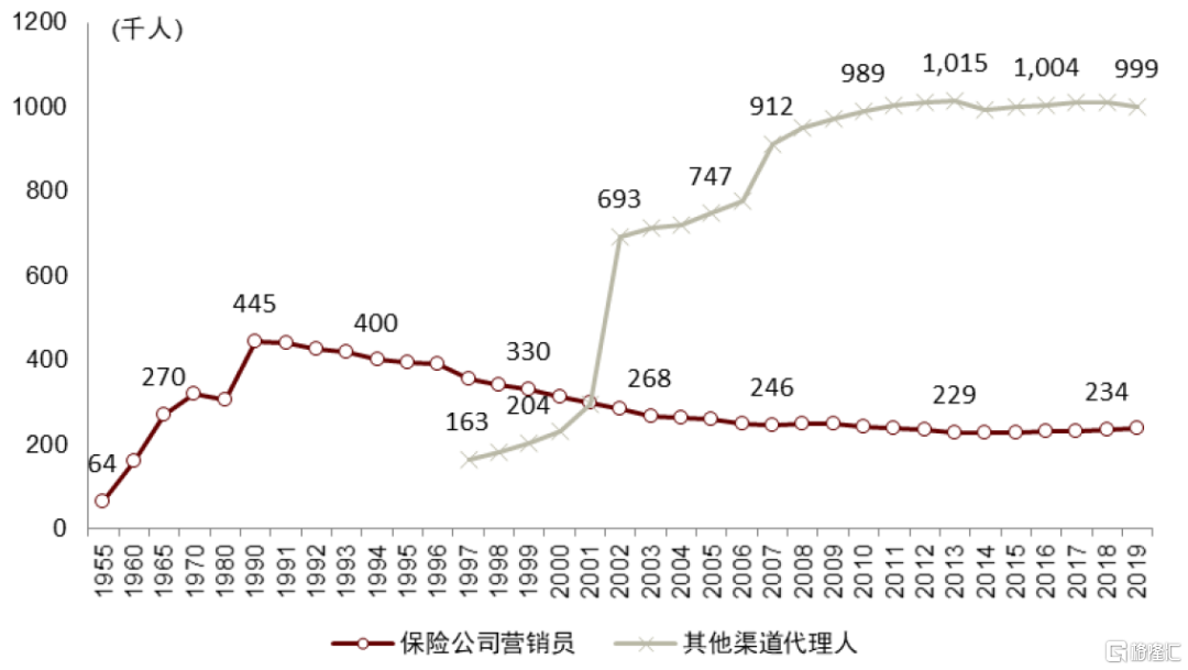 圖表16:二戰後至1990年,日本壽險公司營銷員快速增長;1996年後隨着用户需求多元化及監管放開,其他渠道(包括代理店、銀保等渠道)代理人數量爆發式增長