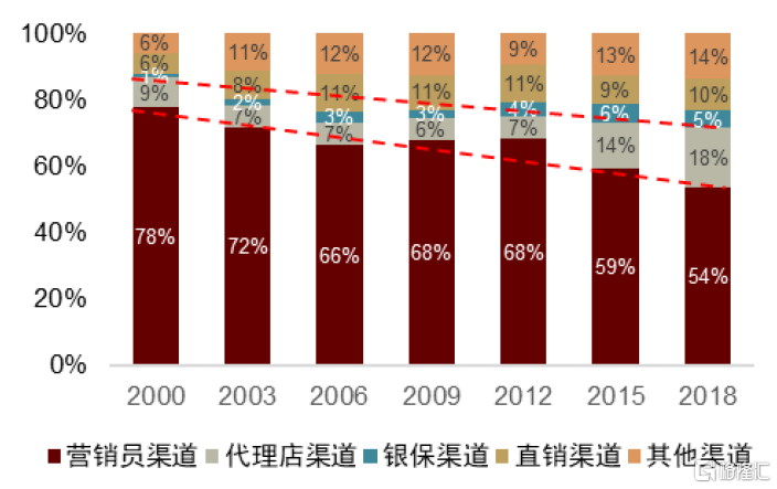 表面上看,日本經紀渠道的崛起主要受政策推動;根本而言,政策出台的背景是保險行業增長乏力,需求方逐漸成為推動市場增長的核心力量,民眾多元化的保險需求得到重視(1975-1990年,日本新購保單中傳統儲蓄險佔比由73.8%下降至17.7%,年金/終身壽險則分別由0.1%/5.1%上升至13.6%/22.5%)。至今,日本營銷員渠道份額在不斷降低,由2000年的78%降至2018年的54%,而代理店渠道份額由2000年的9%提升至了2018年的18%。