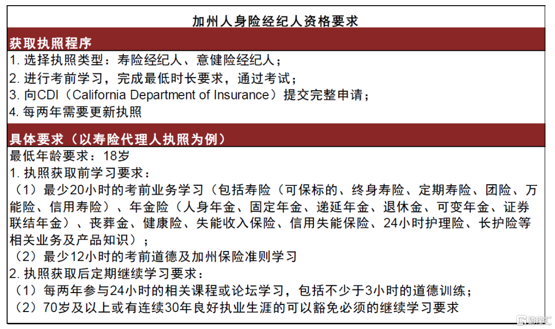 ►經紀渠道自身專業能力:供需格局變化提供發展的外部機遇,而能否攫取該紅利取決於經紀渠道自身的專業能力能否匹配客户需求。海外經紀渠成立以來始終聚焦銷售人員的專業性,美國獨立代理人准入門檻及後續培訓較國內明顯更加嚴格,進而在市場環境發生變化時能夠快速承接客户專業化、複雜化的保險需求。