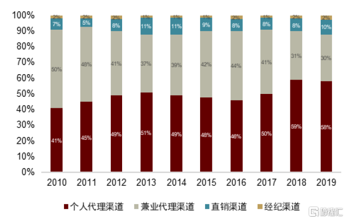 隨着市場紅利結束,保險行業增速放緩,經紀渠道份額重回第一。具體來看: