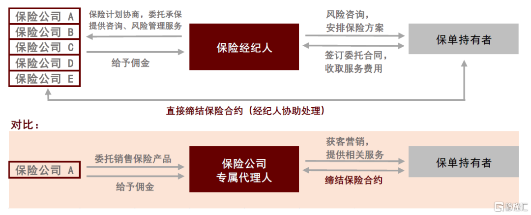 ►從業務模式看,保險經紀人與保險公司專屬代理人不同。保險代理人代表保險公司,與保險公司之間形成委託關係,其中,專屬代理人僅可代理銷售一家保險公司的產品,對於一些消費者而言“推銷屬性”鮮明。保險經紀人則是與客户簽訂委託合同,接受顧客的委託進而提供保險方案設計及風險諮詢服務,並協助客户與一至多家保險公司締結保險合約,以客户為中心的業務模式使其更易獲得消費者的信任。