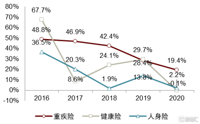 圖表31:近年來,健康險、重疾險總保費增速均快於人身險整體