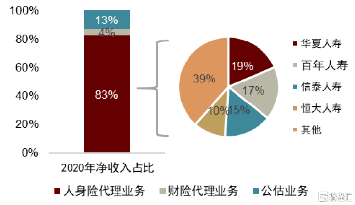 從競爭格局看,中國保險經紀市場高度競爭,頭部化格局尚不明朗。2019年我國保險經紀市場集中度指標CR4為16.6%,CR8為24.5%,份額佔比最高的機構僅佔據5%的市場份額。與可比成熟市場英國(詳見附錄)相比,中國保險經紀行業集中度更低,我們認為主要因行業處於發展初期、發展模式尚不明朗、參與主體採取差異化的發展戰略所致,未來隨着共識進一步形成,行業集中度有望提升。