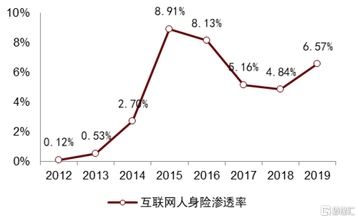注:(1)互聯網人身險滲透率=(互聯網人身險保費+互聯網財產險中意健險保費)/行業總保費。由於互聯網財險中意健險保費收入只有2019年披露準確數據,我們假設互聯網財險中意健險保費收入佔比由2012年2%均勻增至2019年的31%。(2)2015-2017大幅波動主要因部分公司將長護險異化為理財險