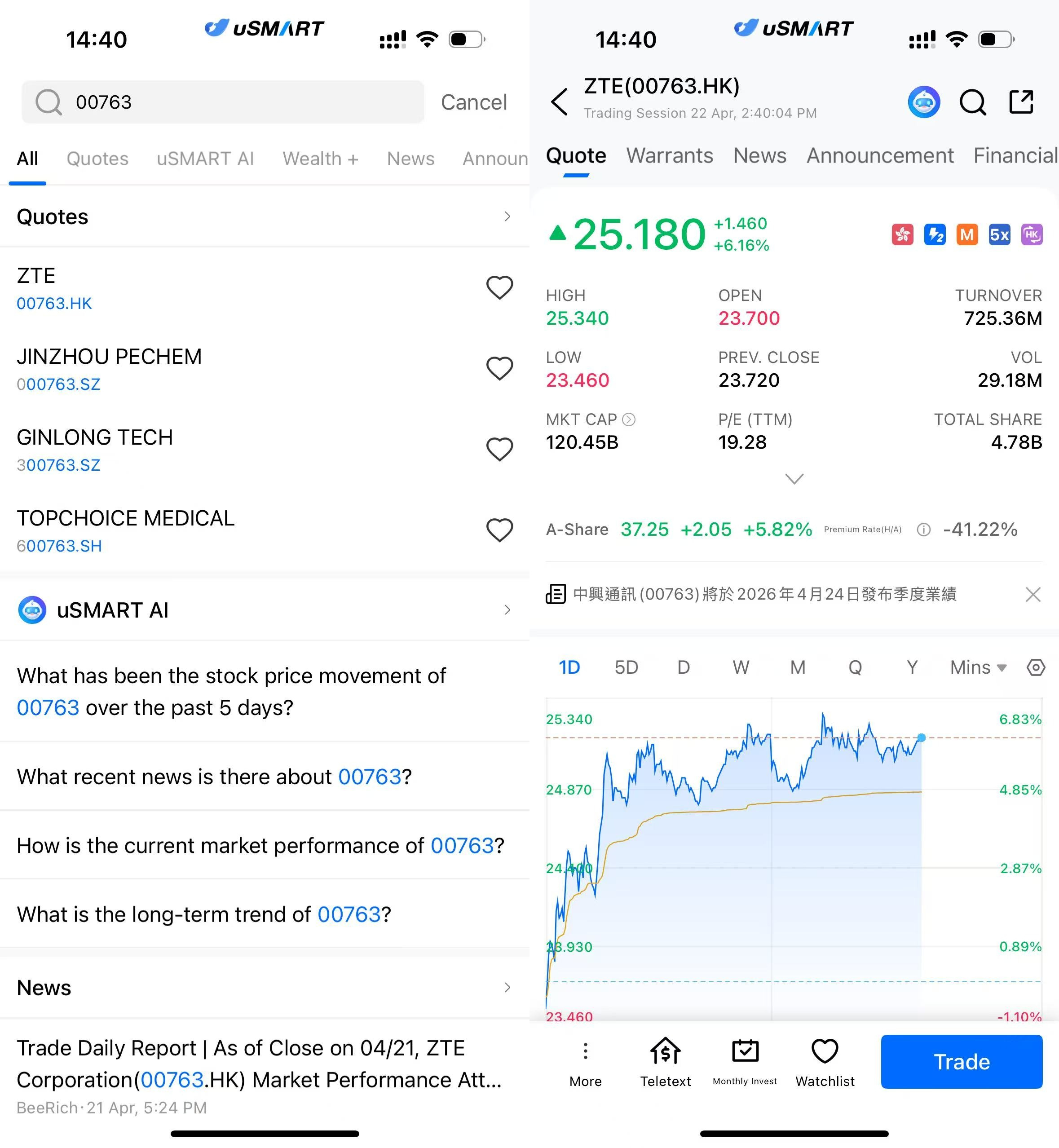 After logging into the uSMART HK app, click the “Search” button in the top-right corner of the page, enter the ticker code (00763.HK) , and navigate to the details page to view transaction details and historical trends. Click the “Trade” button in the bottom-right corner, select the trade type, and submit your order after filling in the transaction conditions.