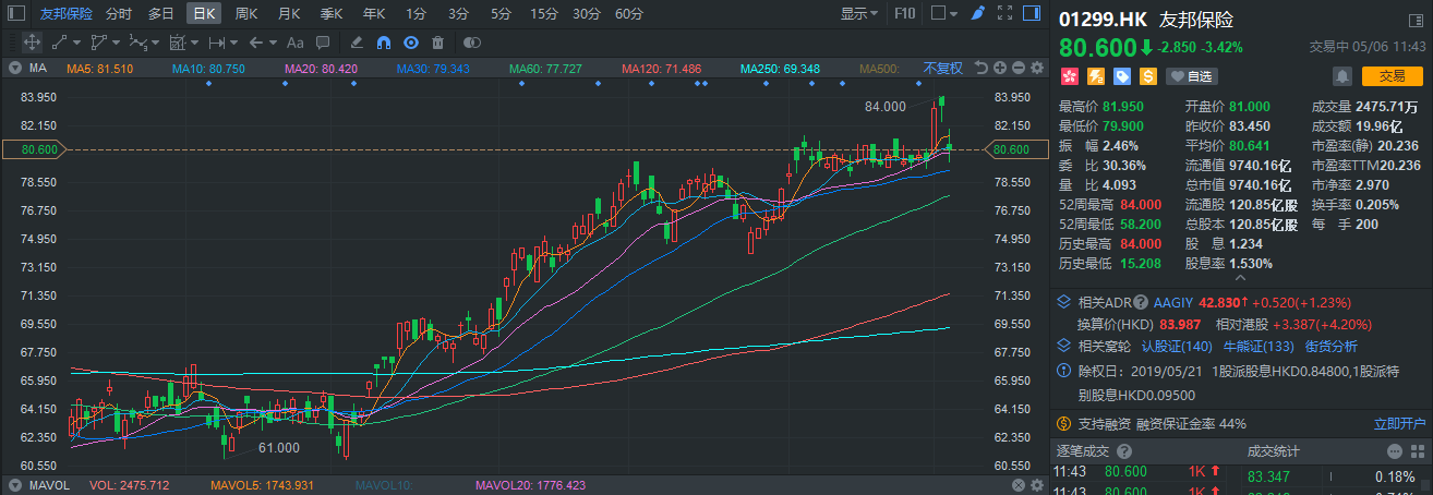 瑞银料友邦(01299.HK)首季新业务价值增23%目标价上调至85.3港元