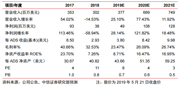 ▍投资建议:维持公司2019-2021年净利润预测49/108/128百万美元,对应每ADS收益为3.80/8.42/9.98美元,对应PE为8/4/3倍,给予目标价38美元(对应2019年10倍PE),维持“增持”评级。