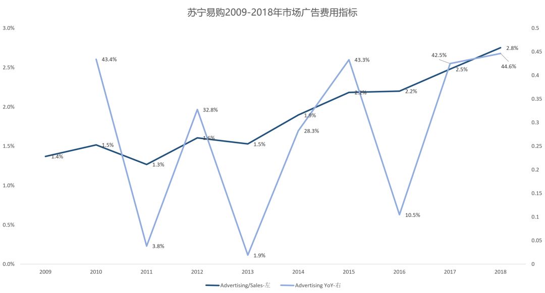 从上述统计中可以发现,大部分核心广告主A/S比例较为稳定,但也有部分公司会根据经营策略做出明显调整。2018年由于宏观环境下行,消费需求弹性比较大的行业公司,都做出了削减广告支出的决策,比如保健品生产商东阿阿胶、汽车业一汽集团和比亚迪、旅游演艺服务提供商宋城演艺、白酒古井贡酒等等。但苏宁易购、永辉超市、青岛啤酒、伊利股份等电商或消费品公司依然处于逆势扩张期,广告投放与营收双增长。不过大多数公司由于业务具有周期性,所以与营业收入相关联的广告费用增速也呈周期性。