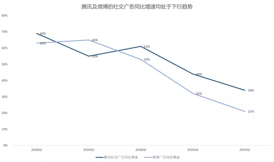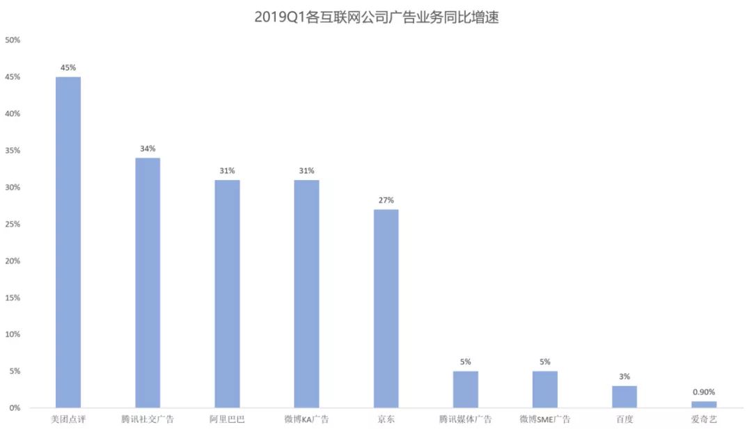 如果放眼全行业,根据CTR数据,一季度全媒体广告刊例花费下降11.2%。光大证券统计,在Q1广告收入大于20亿人民币的互联网公司中,广告业务同比增速比上季度提升的仅有阿里巴巴;微博KA/腾讯媒体/腾讯社交/微博SME广告增速分别环比2018Q4下降了30.4/20.4/9.8/9.5 pct, 增速下滑较为显著;美团/京东等公司广告增速分别环比2018Q4下降3.0/1.0pct,广告业务下滑相对平稳。