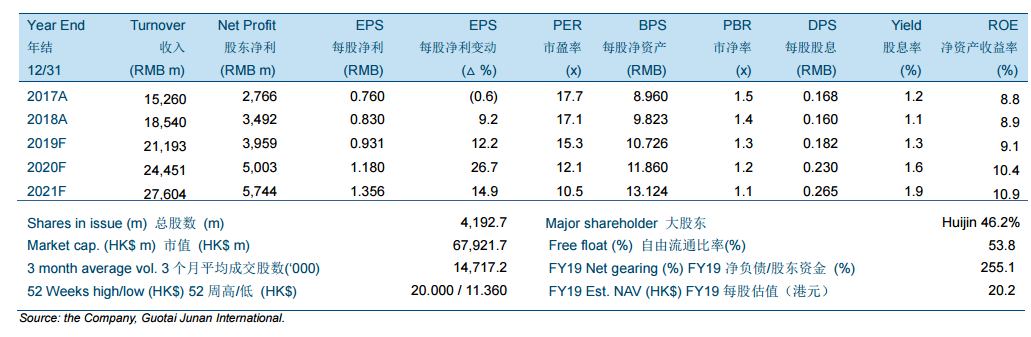 考虑到当前市场估值,我们将我们对公司的目标价从17.34港元上调至20.09港元,相当于19.0倍/15.0倍/13.0倍的2019-2021年市盈率以及1.7倍/1.5倍/1.4倍2019-2021年市净率。同时,我们维持对公司的“收集”投资评级。