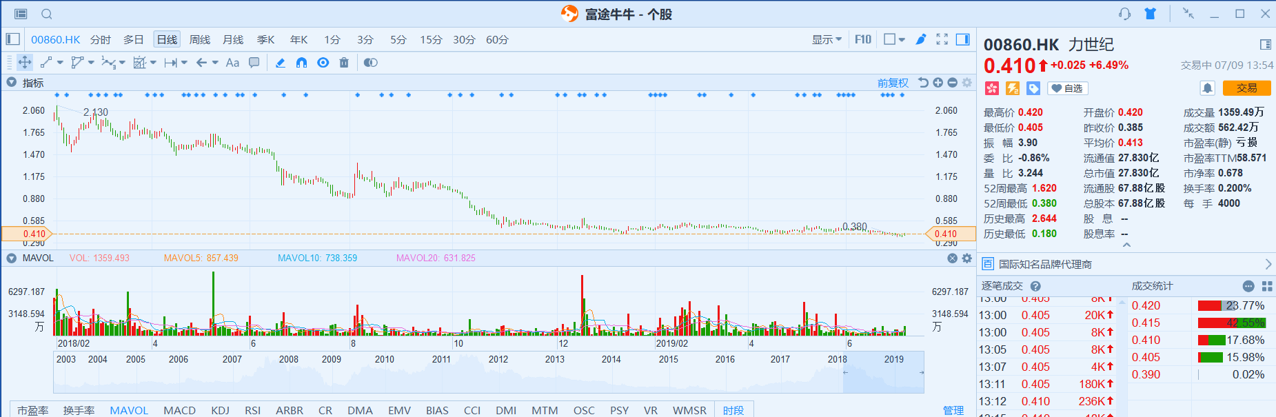 受此消息影响,截止发稿时间力世纪股价大涨6.49%,股价0.41港元,暂时成交1359.79万港元。