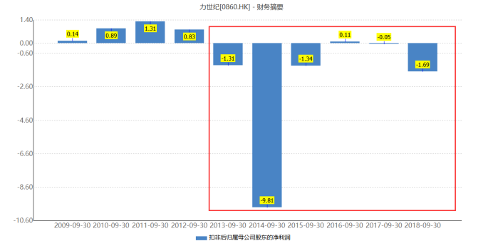 老牌珠宝商,业绩近几年一蹶不振,作为珠宝业务营收占比在8成的上市企业,2018年年报披露,其实现营收7.26亿港元,扣非净利亏损1.69亿港元,同比减少1084.20%。在业绩上2012年之后便开始下滑,其中2014年更是亏损9.81亿港元。