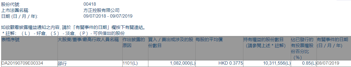 格隆汇获悉,根据港交所最新权益披露资料显示,2019年7月8日,方正控股(00418.HK)获邵行以每股均价0.3775港元,增持108.2万股,总价约40.85万港元。
