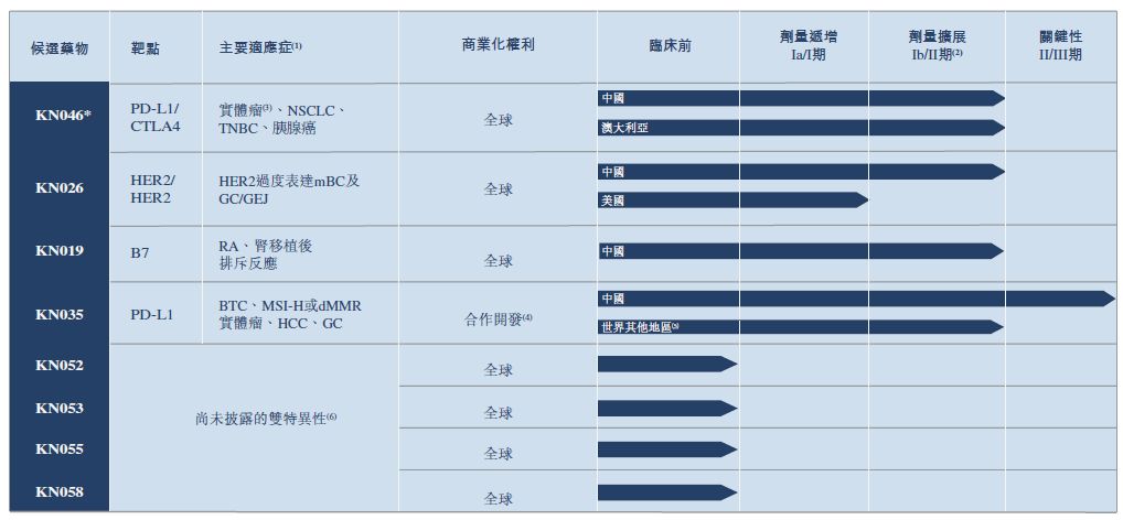 • KN046 :一种BsAb免疫检查点抑制剂,同时靶向两个临床验证的免疫检查点PD-L1及CTLA-4,为潜在突破性的新一代肿瘤免疫特效药。该公司计划在2021年提交用于晚期无法切除/转移NPC的生物制品上市申请(BLA)。