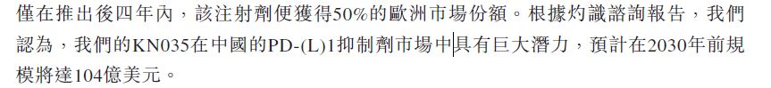 招股书称,KN035在中国的PD-(L)1抑制剂市场中具有巨大潜力,预计KN035在2030年前规模将达104亿美元。